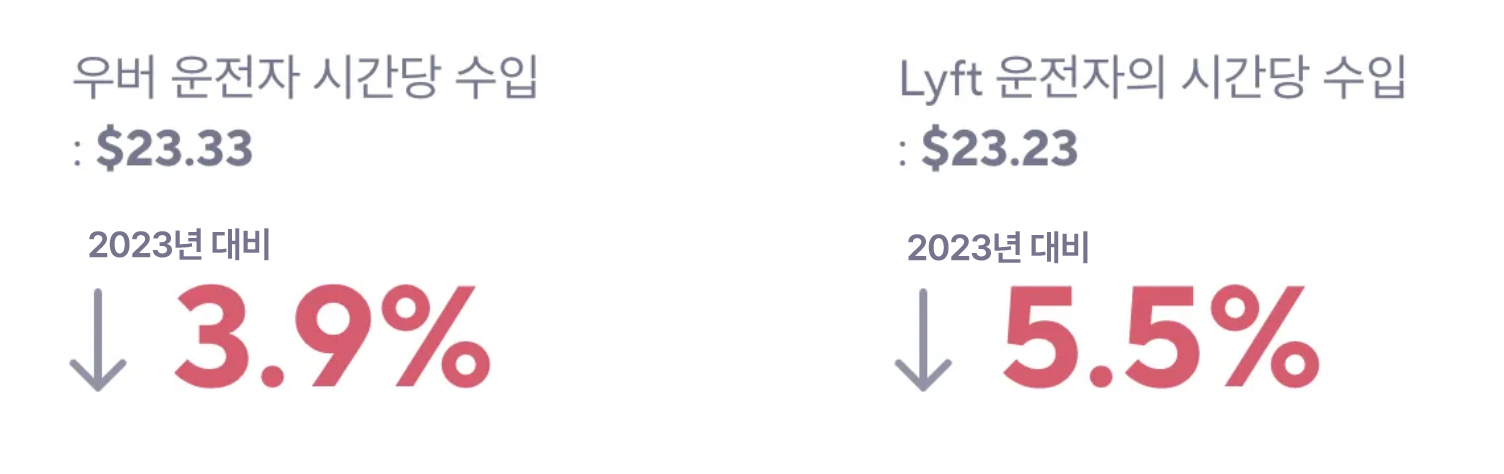 보고서는 미국의 승차공유 플랫폼🚗과 배달·운송 플랫폼🛵에 초점을 맞추고 있어요. 각 플랫폼에서 일하는 노동자들의 평균 수입이 2024년에 전년도 대비 어떻게 변화했는지, 노동시간은 늘어났는지 줄어들었는지, 시간당 수입은 어떻게 변화했는지, 데이터로 보여주고 있습니다.