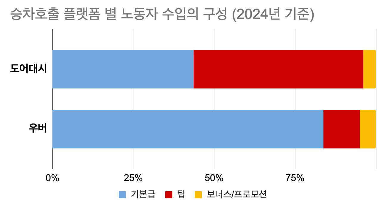 음식배달의 경우 수입의 팁 의존도가 50% 이상으로 높게 나타났지만, 승차호출 플랫폼에서 일하는 노동자의 경우 팁 의존도는 10.4%에 그쳤습니다.