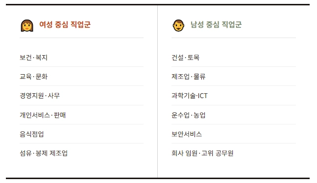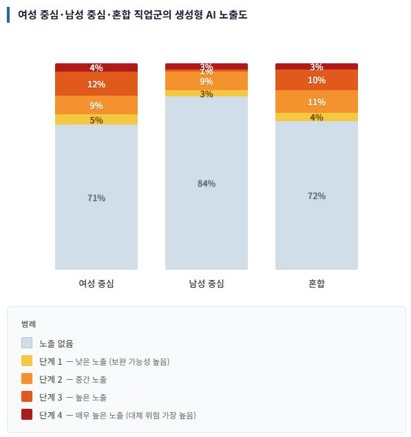 직업을 성별 구성으로 나누어 보면 선명한 패턴이 나타납니다. 여성이 주로 종사하는 분야와 남성이 주로 종사하는 분야가 나뉘어 있고, 이 차이가 바로 생성형 AI 노출도의 차이로 이어집니다.
