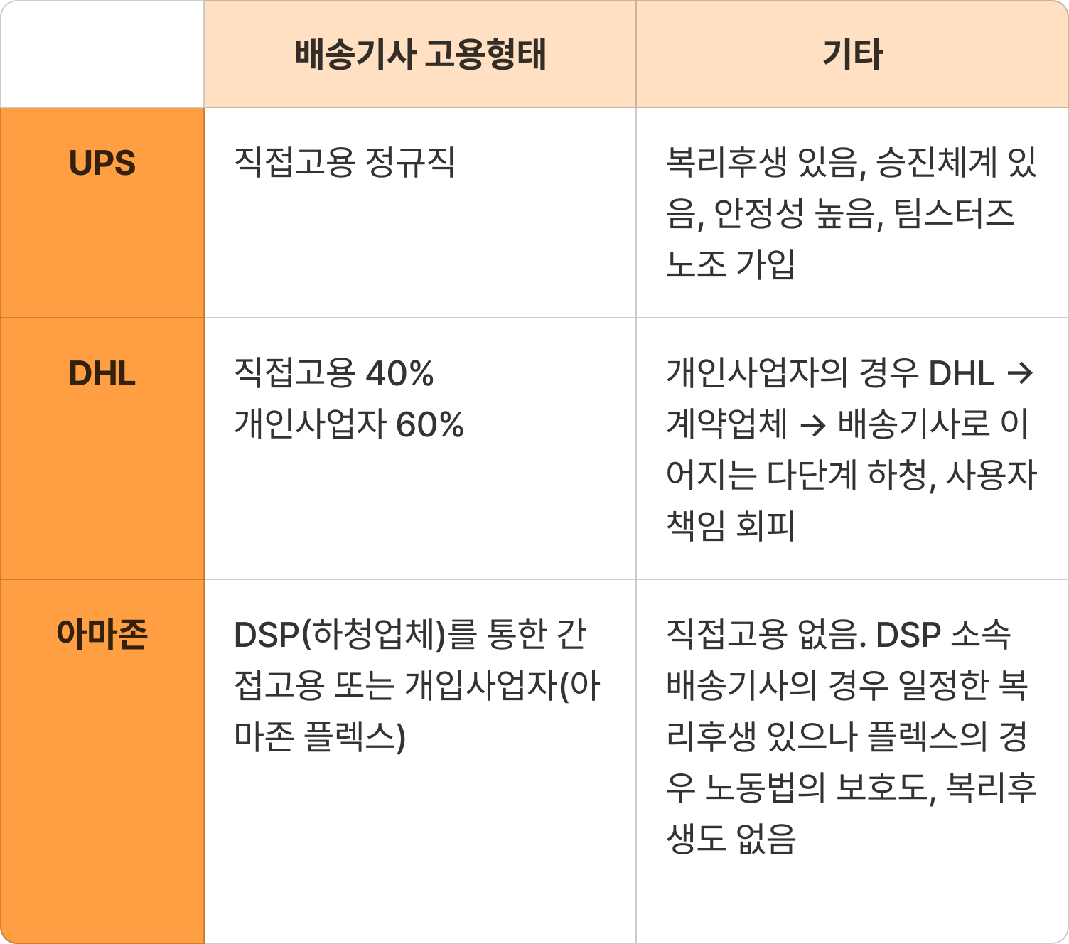 미국 전역에 물류망을 구축하고 있는 다른 택배사들과 아마존의 배송기사 고용형태를 비교하면 아래와 같아요.