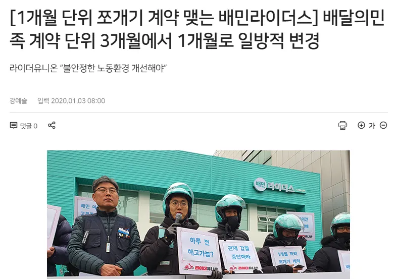 배민이 한창 성장하던 시기, 라이더들은 ‘배민라이더스’라는 이름으로 (주)우아한청년들과 업무위탁계약을 맺고 일했어요(나중에 배민라이더스에서 배민1으로 바뀜). 원래 3개월 단위로 계약서를 작성했는데, 2019년 12월에 회사측이 일방적으로 1개월 단위 계약으로 바꿨어요.