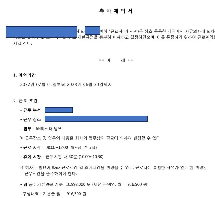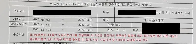- 언론에 보도된 사례를 보면 계약기간이 3월 1일부터 7월 18일까지인 경우, 그리고 8월 29일부터 12월 20일까지인 경우가 있었습니다.