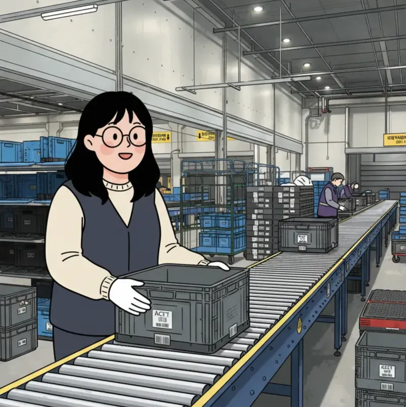 제가 일했던 쿠팡 물류센터를 O캠프(정식 명칭은 O 서브허브)라고 할게요. 작업 현장의 문을 여는 순간 거대한 오토 소터의 ‘우웅~’하는 기계음과 철제 롤테이너, 물류 적재용 파레트, 전동 자키 등이 서로 부딪히는 소음이 밀려와요. 땀 냄새도 나고요. 사람들은 정신없이 움직이고, 수많은 택배 차량과 끝없는 레일이 보여요.